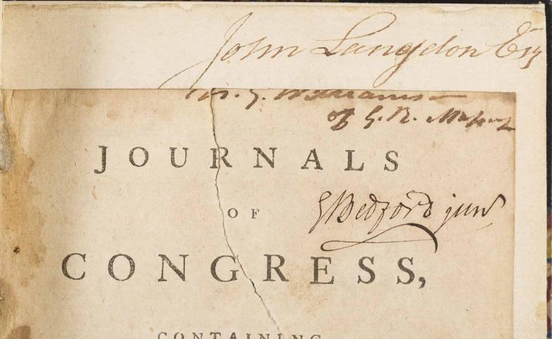Volume III of the Journals of Congress, with the signatures of John Langdon and Gunning Bedford, Jr. Bidding begins at $10,000.