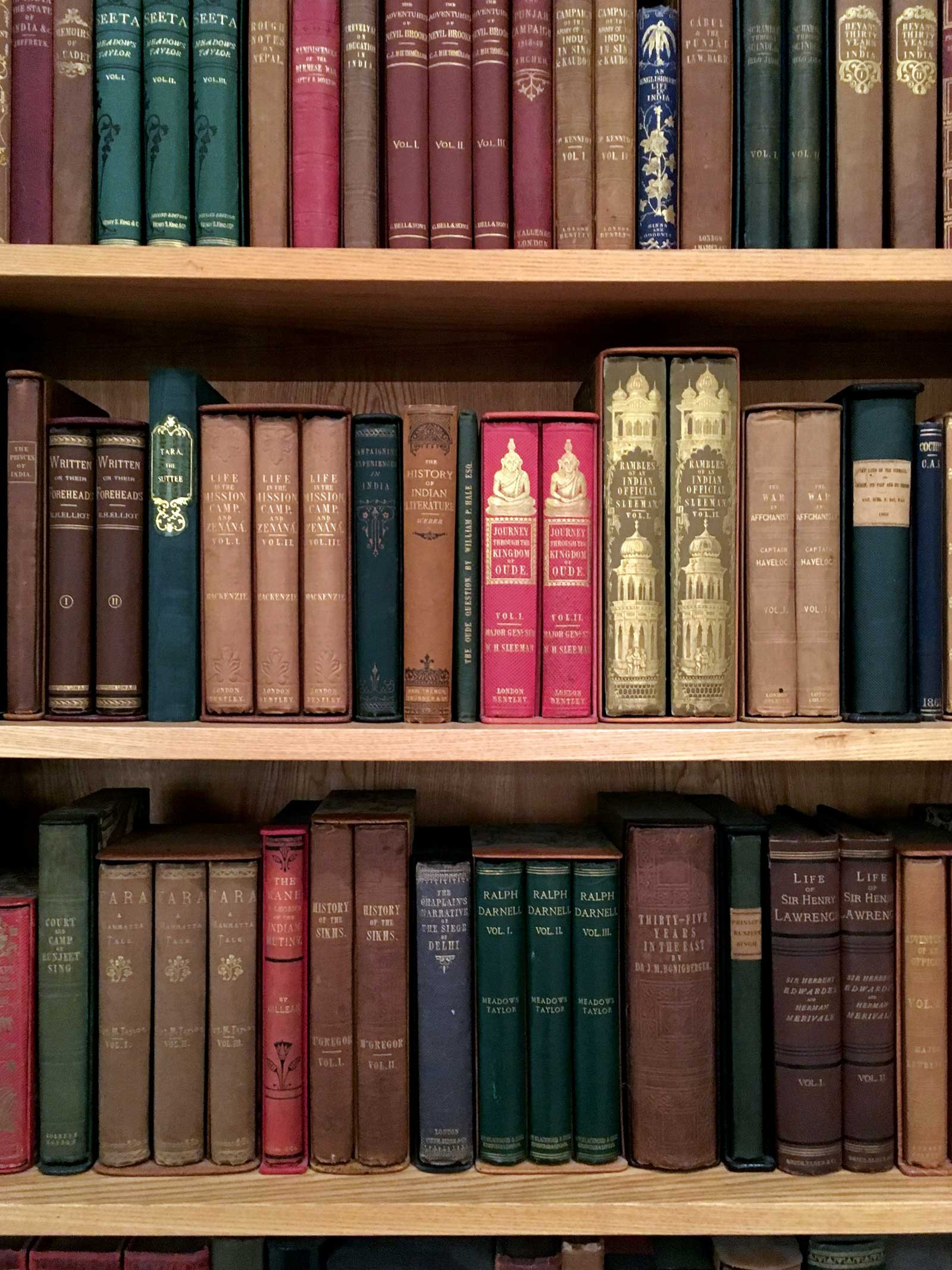 No less than Graham Shaw, the former head of Asia, Pacific & Africa collections at the British Library and one of the most respected book historians of South Asian print history, has said that he has seen nothing like it in all his years of looking at India’s early printed books. “Every time I visit Richard’s library, I have no idea what new wonders I will see. The door opens and your gaze is irresistibly drawn to shelf after shelf … lined neatly with cloth bindings in beautiful condition. The eyes flit hungrily from title to title: Tavernier’s Travels in India in blue, Shakespear’s Wild Sports of India, Allen’s Diary of Sinde and Affghanistan in red with a Pathan marksman at its head, Meadows Taylor’s three-decker novel Seeta distinctive in green, Karaka’s History of the Parsis with Ahura Mazda in gilt, and Herklots’ On the customs of the Moosulmans of India with its twin minarets. Move further in and it gets better.”