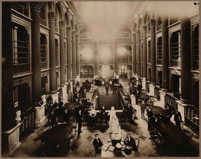 The room BPL’s Founding Research Collection was originally housed in on Boylston Street, 1858-1895.