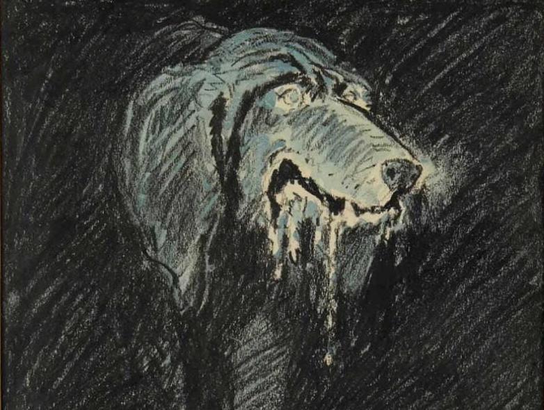 Frederic Dorr Steele, ‘The Slavering Hound,’ 1901-2, unpublished illustration created for The Hound of the Baskervilles. Crayon and watercolor on paper. Sight: 10 x 9 7/8in. Estimate: $800-1,200