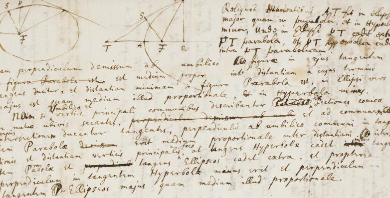 The autograph manuscript, handwritten in Latin on paper, comprises one and a half pages, with 39 lines in Newton’s hand, alongside 14 lines and two diagrams  by the Scottish mathematician and astronomer David Gregory. The draft revisions relate to key sections from each of the three books of the Principia, on the compression of liquids, the orbits of comets and the motion of bodies in eccentric conic section.