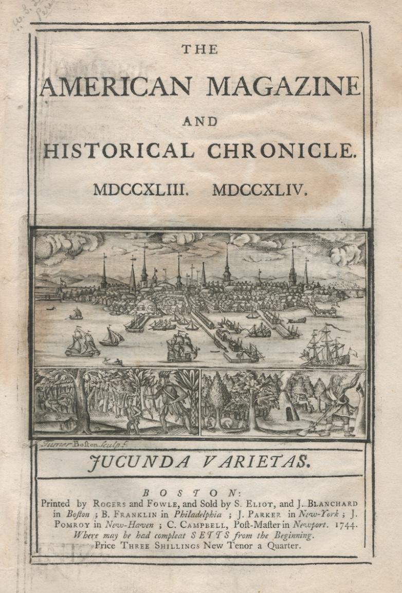 The American Magazine and Historical Chronicle, vol. 1, frontispiece, 1744. The first successful American magazine, sold by Benjamin Franklin in Philadelphia.