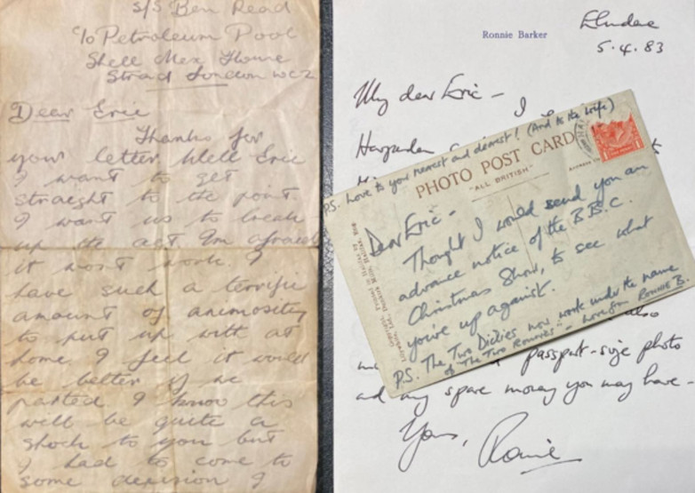 The letter from Ernie Wise to Morecambe (left) and from comedian Ronnie Barker (right)