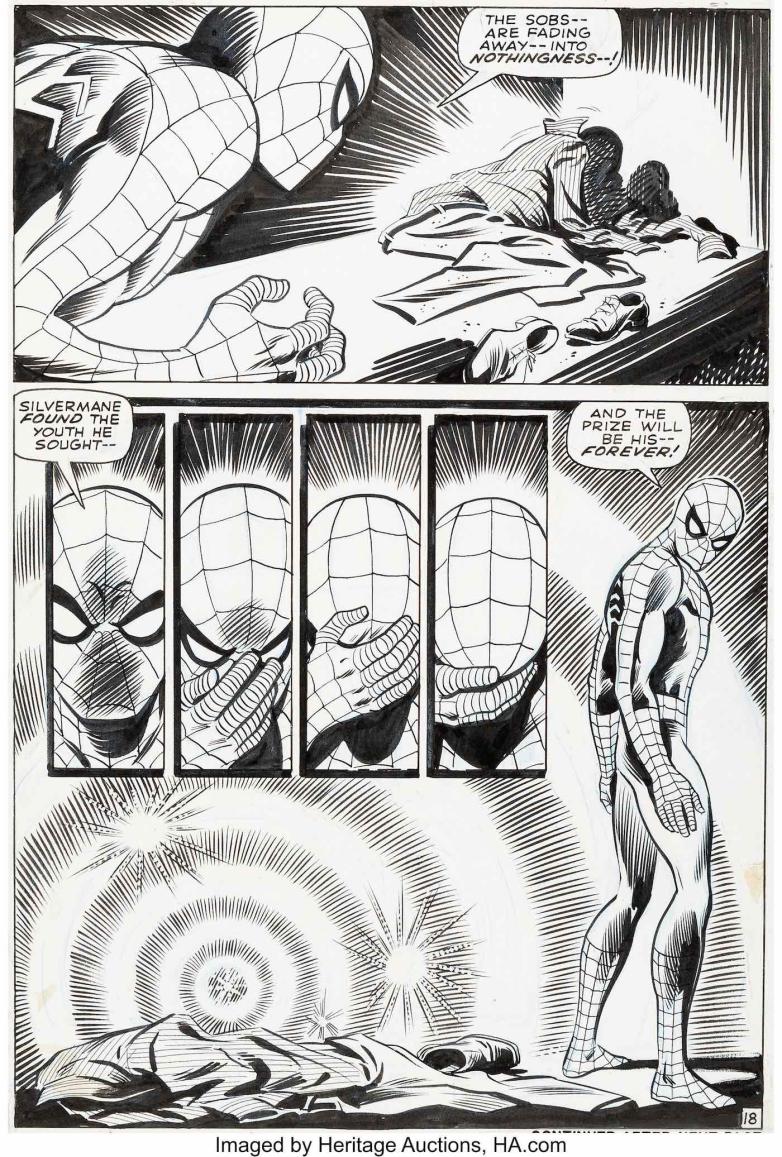 Among the offerings is Page 18 from 1969’s Amazing Spider-Man No. 75, in which Spider-Man watches the vanishing of the villain called Silvermane, who seems to de-age until he fades into “nothingness.” Romita and inker Jim Mooney feature the hero in every single panel as he anguishes over the heart-rending end of the gangster born as Silvio Manfredi. The page echoes the image on the cover of this classic issue.