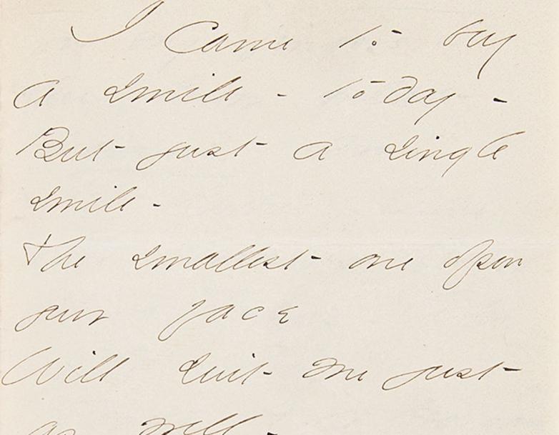 A handwritten poem by Emily Dickinson, ca. 1861, soliciting a shopkeeper's smile.