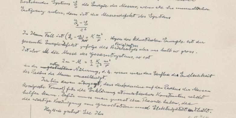 In this letter, written in 1946 in response to a query from Silberstein, Einstein calculates the mass difference between a system of two equal masses, m, an infinite distance from one another, and the same two masses a distance r apart, orbiting about their common center of mass. (At infinity the kinetic and gravitational potential energies both vanish, while at r, they do not. This energy difference is equivalent to a mass difference between the two configurations.) It is not a difficult exercise, and, as Einstein points out, “can be answered from the E = mc2 formula, without any erudition.”