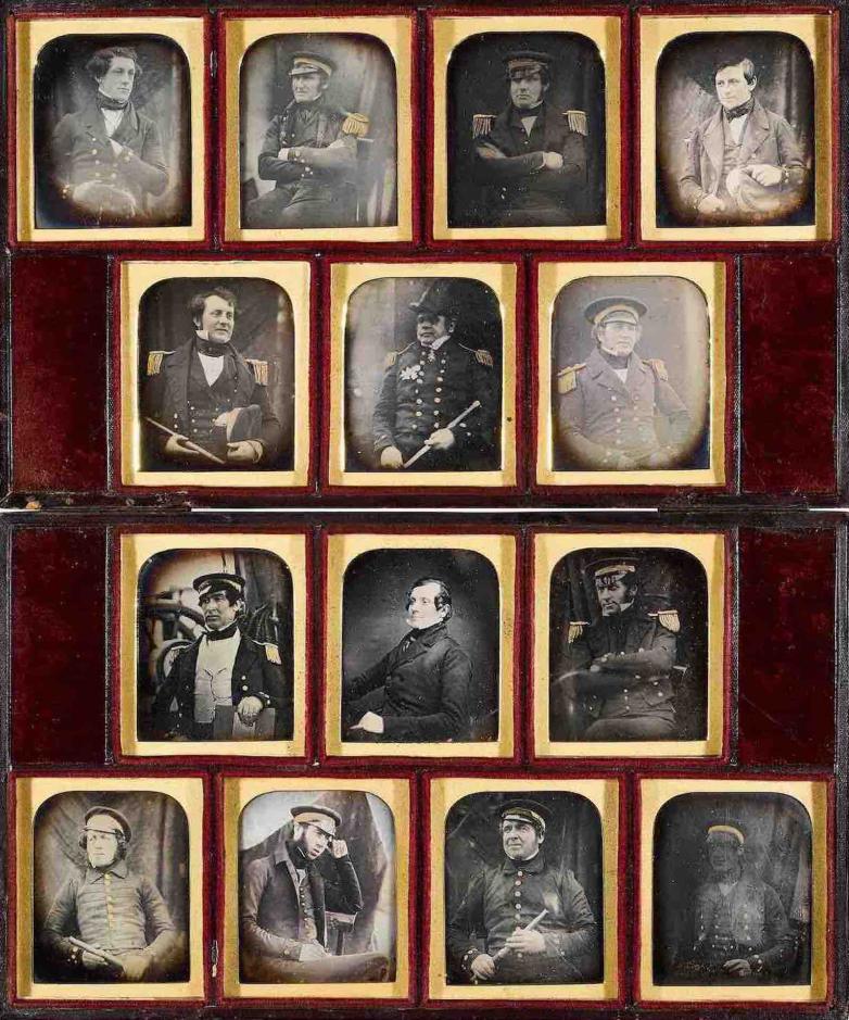 The 14 sixth-plate daguerreotypes (70 x 83mm.) are each hand-tinted coloured with shell gold applied to the buttons, hat bands and epaulettes of the officers' jackets, each inscribed on the verso (in ink or etched with a stylus, denoting name and sometimes rank of sitter, name of ship on which they served, and date), and housed in a contemporary partitioned, book-form morocco case (203 x 339 x 22mm).