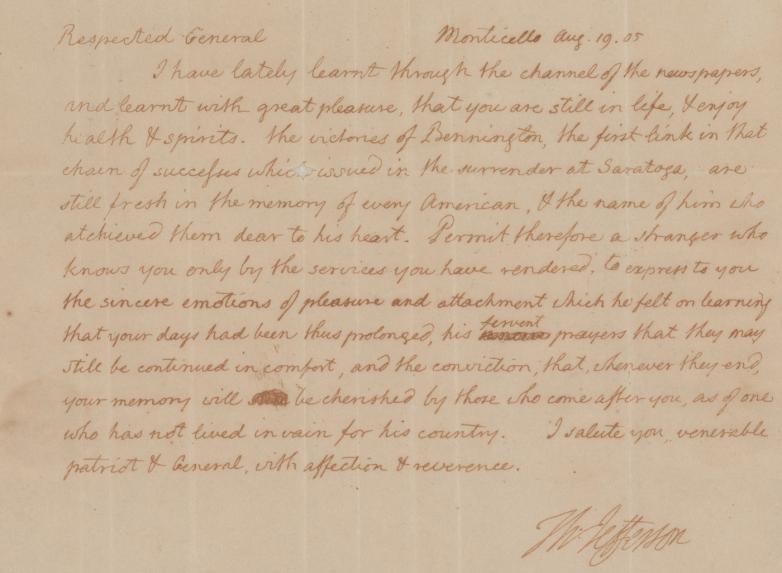 A handwritten letter by Thomas Jefferson to war hero John Stark. Estimate: $60,000+