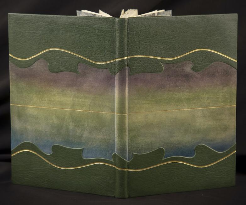 The exhibition includes an experimental Victorian wooden binding, and work by Paul Delrue and Julian Thomas, the library’s former head of binding and conservation, later awarded an MBE for services to conservation science and bookbinding. Thomas also worked closely with leading twentieth-century Welsh artist Sir Kyffin Williams. They collaborated on several designs for Kyffin’s books such as his autobiography Across the Straits.