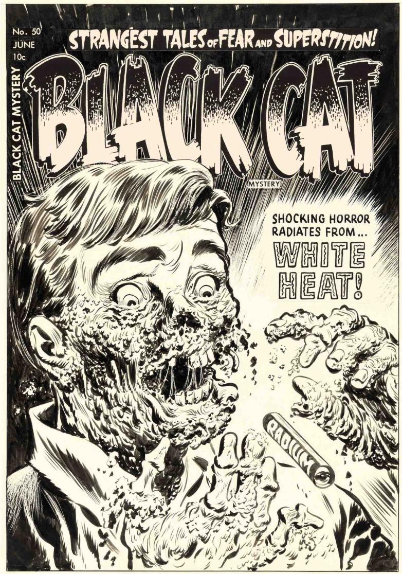 Leading the sale is Lee Elias’ original art for hands-and-face-melting cover of Black Cat Mystery No. 50, a title that became one of the more horrifying reads on newsstands. The issue hit newsstands in June 1954 just as psychiatrist and author Fredric Wertham was decrying comics to the Senate Subcommittee on Juvenile Delinquency and the comics industry was opting to self-censor rather than risk government regulation.