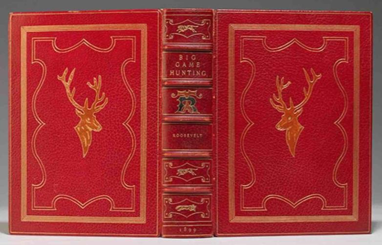 Signed limited first edition, number 853 of 1000 large-paper copies signed by Roosevelt beneath the frontispiece portrait, with 55 illustrations by Remington, Frost, Beard, Sanford and others, including four etchings by R. Swain Gifford and numerous wood-engraved text illustrations. This copy very handsomely bound by the publisher in full morocco with pictorial morocco onlays, including the cover emblem of a stag after an original design by Roosevelt.