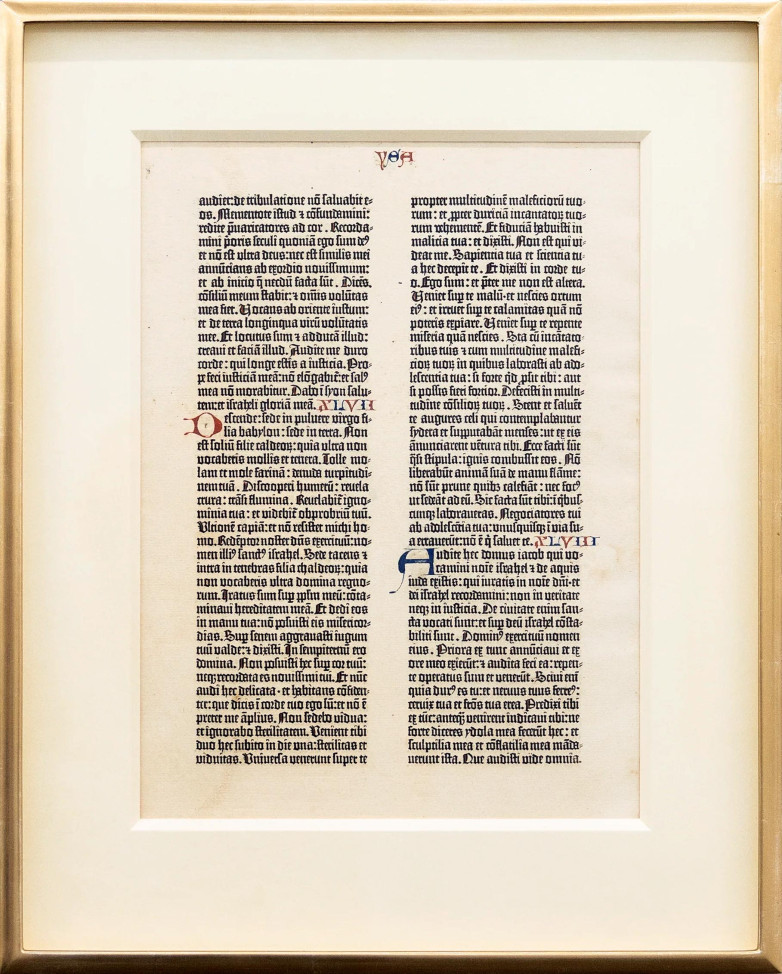 "This is undoubtedly the rarest item I have encountered thus far," said Oliver Bayliss. "Only 49 complete bibles are known to exist and these are with museums and institutions. In the 1920s rare book dealer Gabriel Wells split an incomplete copy and sold the leaves of which there were 568. 466 have been found and this is one of those. The others are still wandering yet to surface.