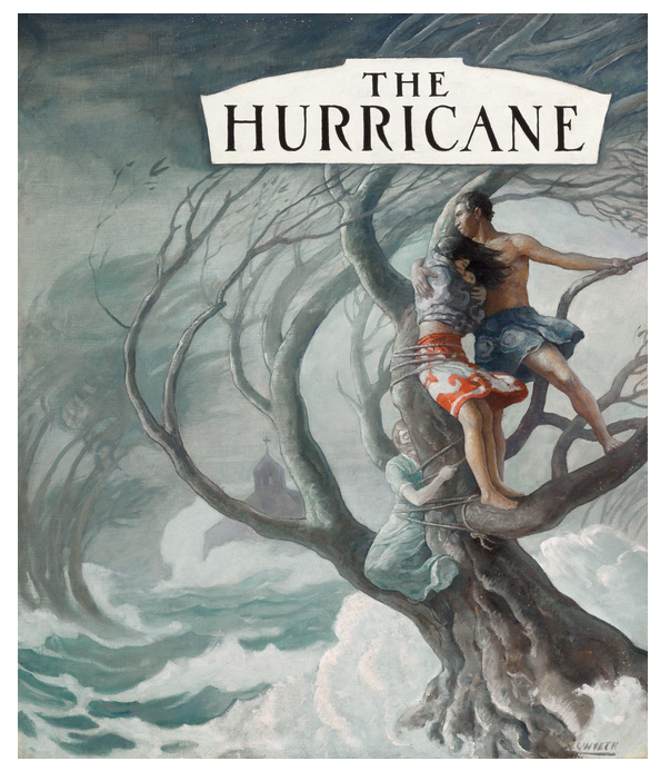 In 1935, the publishing company, Little, Brown commissioned N.C. Wyeth (1882-1945) to create the dust jacket art for a novel called The Hurricane. It was the tail end of the “golden age of illustration,” and Wyeth, one of America’s greatest illustrators, having created nearly 4,000 illustrations for books and magazines during a four-decade-long career, produced this dynamic oil on canvas depicting a harrowing storm.