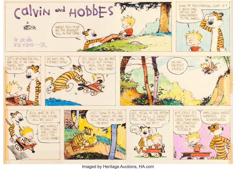 The 1987 Sunday strip that sold Thursday is quintessential Calvin and Hobbes, beginning with the boy and his best friend perched atop a hill, hoping their red wagon will hurtle them into a time warp and a future filled with "flying cars and cities built on clouds, maybe!" Calvin, forever the only child looking for a way to escape into a different time or a better, more exciting place, instead finds himself at the bottom of the hill – two minutes into the future, better than nothing. "Things haven't improved," says Hobbes. "I'm disappointed."
