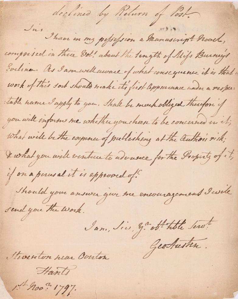 Letter from George Austen, father of Jane, from 1797 offering the novel later to be known as Pride & Prejudice for publication. (MS 279)