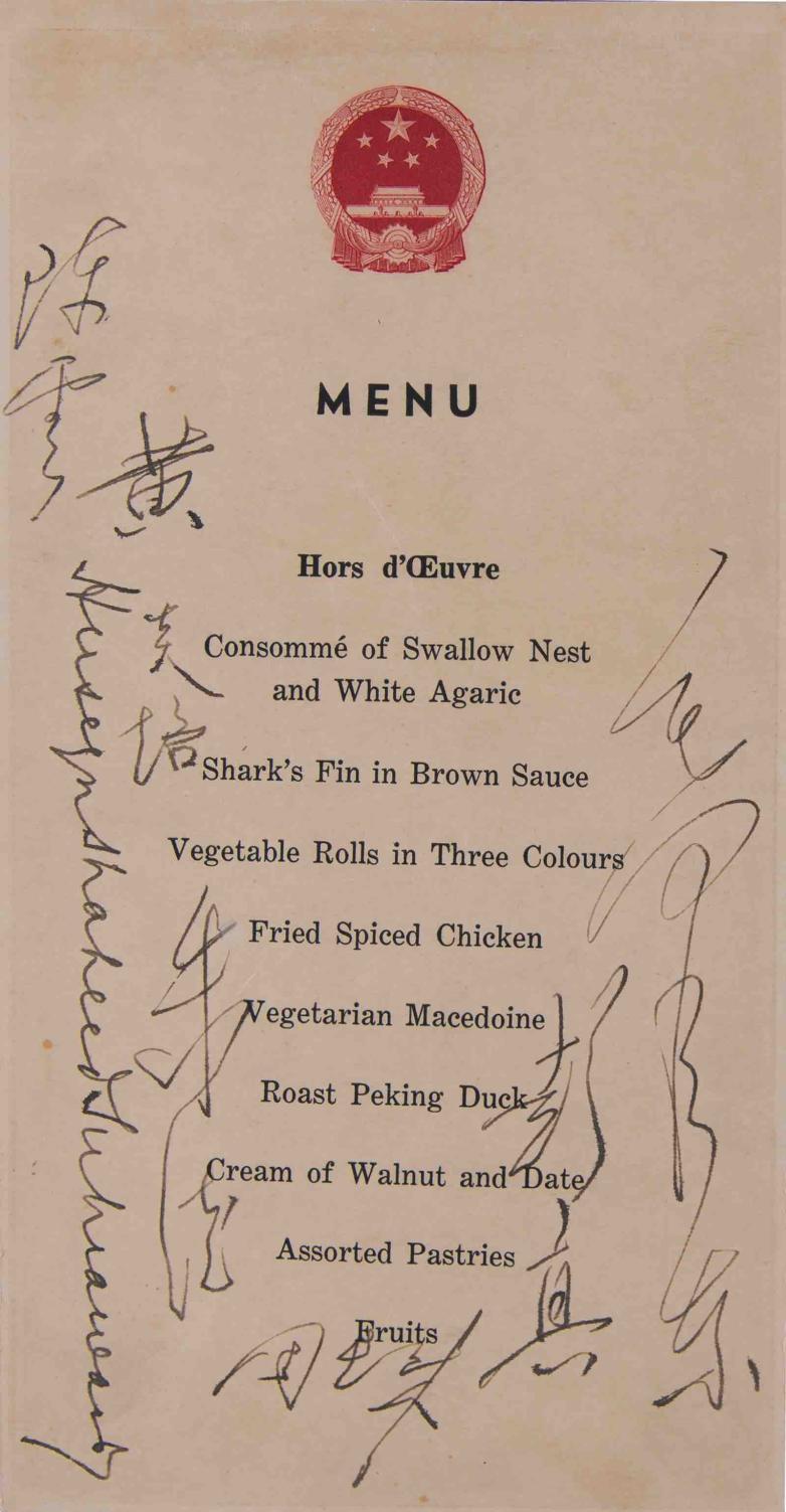 Among the illustrious signatories on the menu were Huang Yanpei (Vice Premier of the State Council and Minister of Industry), Peng Zhen (Mayor of Beijing and later Chairman of the National People's Congress), Chen Yun (a leading economic politician and Party Vice Chairman), and Zhu De (Vice Chairman of the Communist Party and the PRC, renowned as Mao's military advisor).