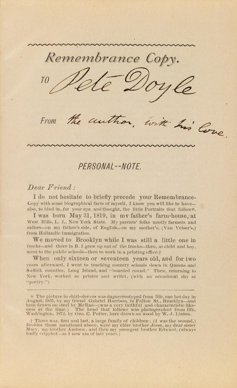 Walt Whitman, Memoranda of the War, remembrance copy, inscribed to Peter Doyle, sold for $70,000.