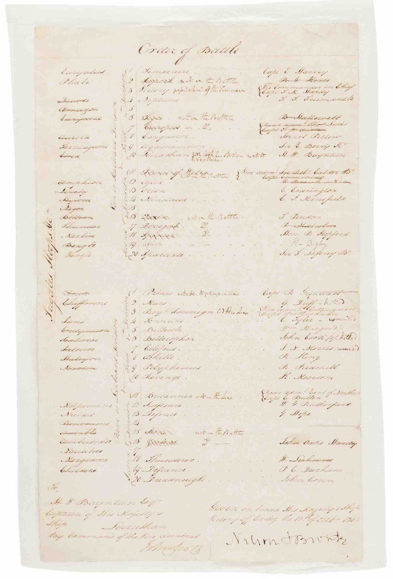 A signed 'Order of Battle' document issued by Vice Admiral Horatio Nelson from HMS Victory days before the Battle of Trafalgar has sold for $189,888 in RR Auction’s Remarkable Rarities sale.