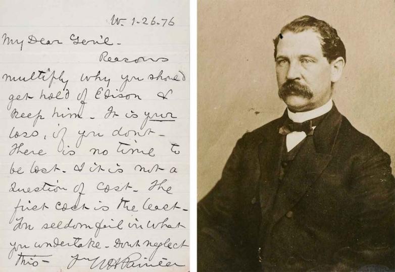 Left: “…get hold of Edison & keep him,” urged a promoter of Thomas Edison’s quadruplex telegraph to Thomas Eckert, president of the Atlantic and Pacific Telegraph Co., in 1876. Thomas T. Eckert Papers. Right: Thomas T. Eckert, circa 1862.