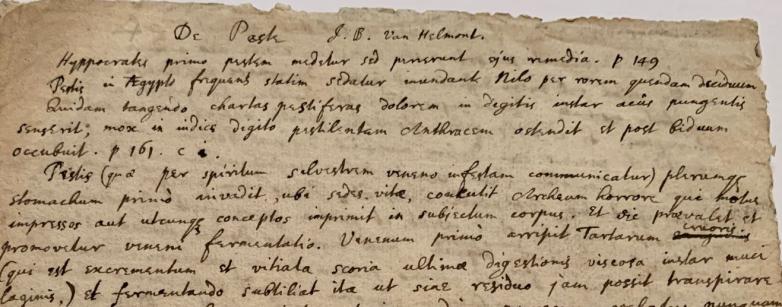 The manuscript is the most substantial written statement Newton is known to have made about the plague. In analyzing and distilling Van Helmont’s first-hand and medical knowledge, Newton records both causes, modes of transmission, and cures, identifies symptoms and their identification, as well as prescriptions for avoiding the plague. He notes, for instance, the case of a man who having touched “pestilent papyrus, immediately felt a pain like a pricking needle, and developed a pestilent ulcer in the forefinger, and died in two days."
