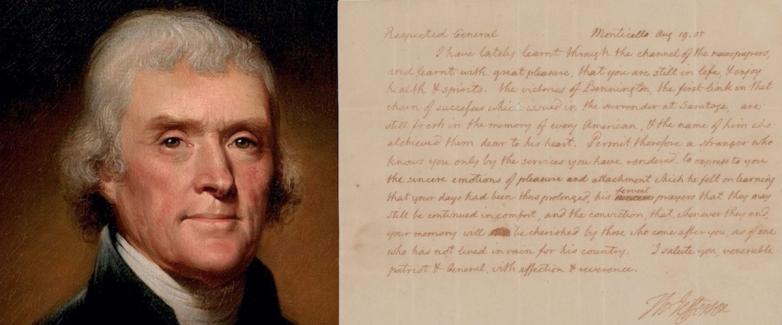 The one-page handwritten letter signed as president, signed "Th: Jefferson," dated August 19, 1805. Handwritten letter from Monticello to General John Stark, in part: "I have lately learnt through the channel of the newspapers, and learnt with great pleasure, that you are still in life, & enjoy health & spirits. The victories of Bennington, the first link in that chain of successes which issued in the surrender at Saratoga, are still fresh in the memory of every American."