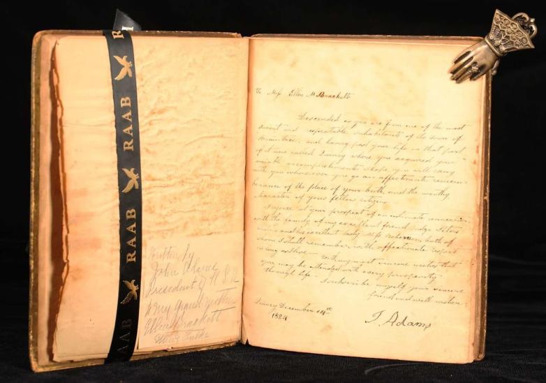 The volume belonged to Adams’ neighbor, Ellen Maria Brackett, and was handed down through her Massachusetts family continuously before its acquisition this year by Raab. It sold for $40,000 and had not been publicly offered for sale before. Its contents were unknown until now.