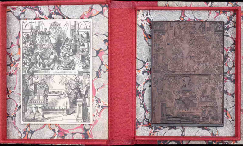 an electrotype for the frontispiece of Alice’s Adventures in Wonderland, People’s Edition (1887). The Brothers Dalziel, master engravers, were commissioned to engrave the boxwood blocks on which Tenniel had made his drawings. However, the engraved blocks could not withstand commercial printing of the volume of books required and so instead they served as the masters from which electrotype copies were made.