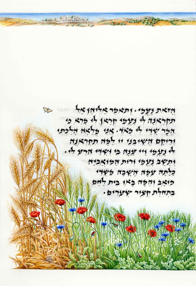 The Barley of Beth-Lechem.The Joanna S. Rose Illuminated Book of Ruth, in Hebrew and EnglishUnited States, New York, and Israel, Jerusalem, 2015-17 Commissioned by Joanna S. Rose, written by Izzy Pludwinski, designed and illuminated by Barbara Wolff. MS M.1210, fol. 9r Gift of Joanna S. Rose, 2018 The Morgan Library & Museum