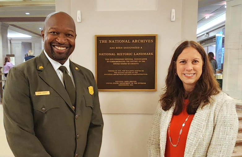 Archivist of the United States Dr. Colleen Shogan (right) and Brian Joyner, acting superintendent of Rock Creek Park (left), stand in front of the National Archives Building Historic Landmark plaque.