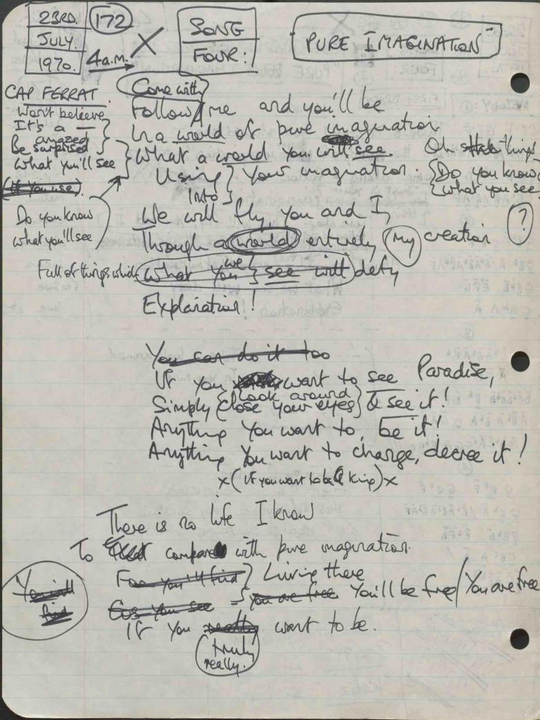 Leslie Bricusse lyric sketches for Pure Imagination from Willy Wonka and the Chocolate Factory (1971)