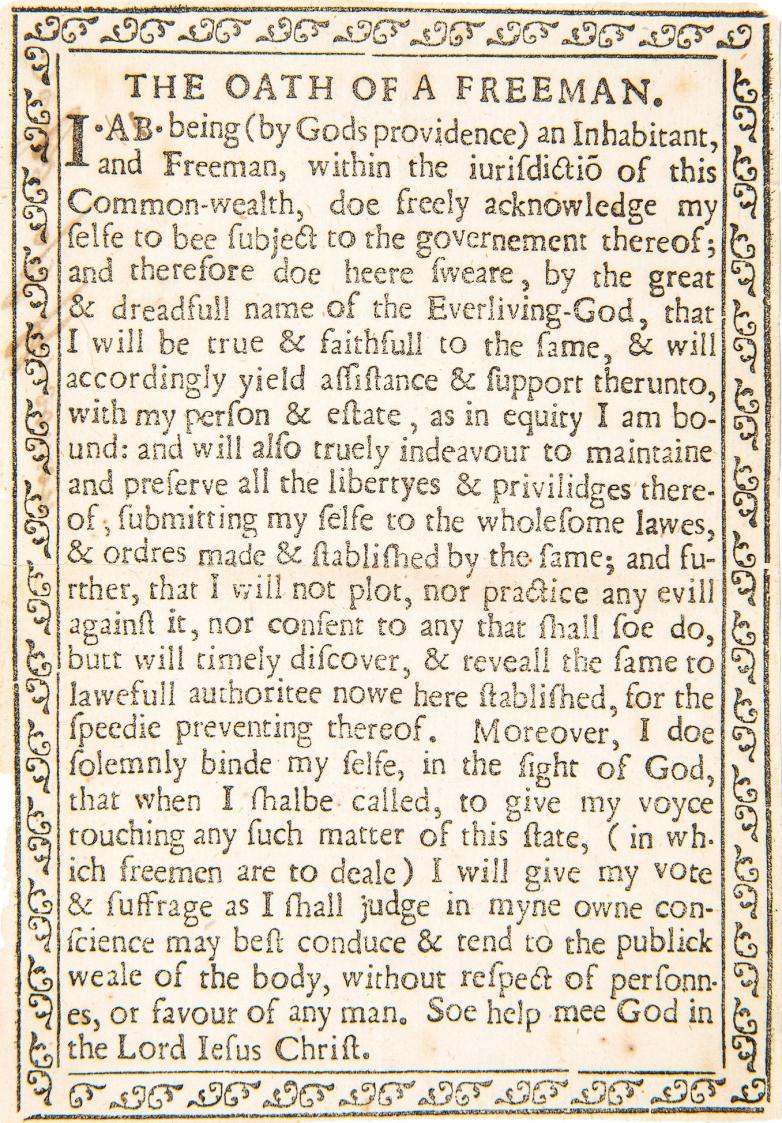 The original “Oath of a Freeman,” printed in 1638 or 1639 by Stephen Daye in Cambridge, Massachusetts, was known only by a second printing a decade later. Hofmann, famed for his forgeries of handwriting, proved he was also adept at printing, and brazen at both.