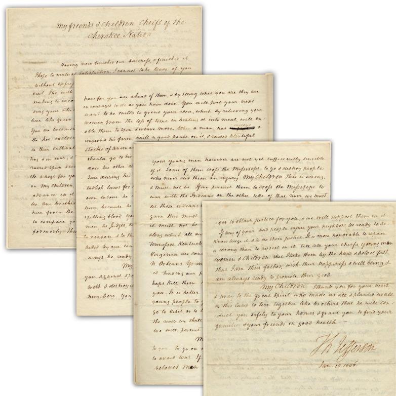 Handwritten four-page presidential address signed by Thomas Jefferson in 1806 and directed to the Cherokee Nation, embracing his role as the “Great White Father.” Estimate: $90,000-100,000