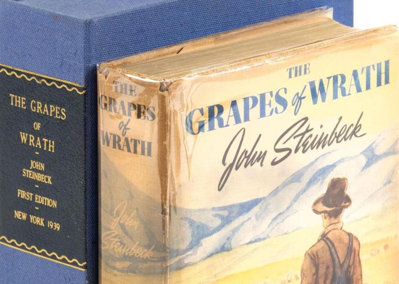 An inscribed presentation copy of Steinbeck's Grapes of Wrath (1939) signed by the author to author and reporter Vincent Sheean could sell for $15,000–25,000. Other lots include a first edition of Johnson's Dictionary (1755), estimated at $8,000–12,000 and a first edition of Webster's American Dictionary of the English Language (1828), at $5,000–8,000.