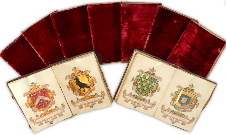 A set of nine illustrated heraldic manuscripts bound in red velvet, presented to Queen Elizabeth I and offered at Sotheby's this week.