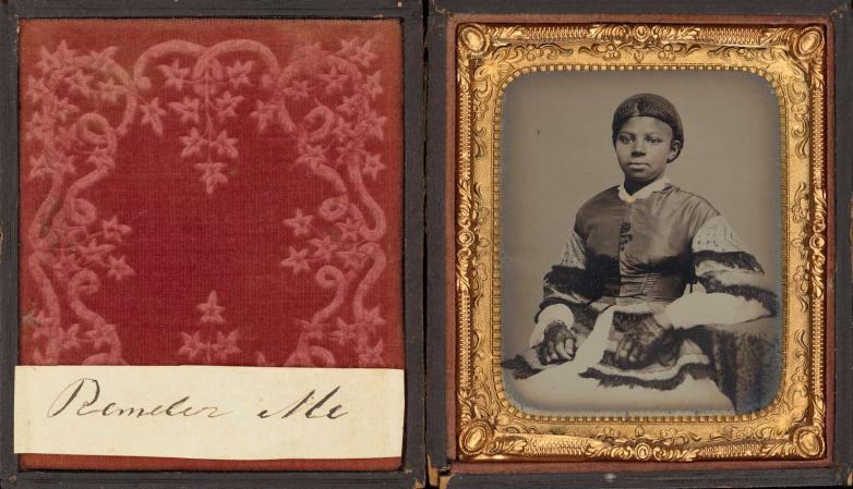 Most of the pictures in the Kelbaugh collection were made to bear witness to Black pride and accomplishment. Although the identity of several of the people depicted is unknown, their elegant clothing and determined, self-confident expressions suggest that they were freemen and freewomen eager to record their prosperity. Many were made to ensure that history remembered their subjects, such as the tintype with color applied by an unknown artist that included a slip of paper inscribed “Annie/Remember Me.”