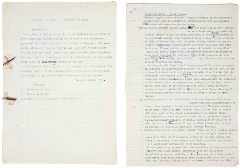 "Ever since we published our large and improved map of Sodor in 1971," he writes, "I have had letters asking how it came to be discovered. Questions are asked too about the various railways, and the names of the places they serve, Many people also want to know about the Fat, Thin, and Small Controllers, together with other characters who come into their stories, and with them the people who have given their names to places on the map." In a typewritten note to Allcroft with blue ink annotations, Awdry adds" "Most of these documents are unique. So please let me have them back when finished with./ W. Awdry."