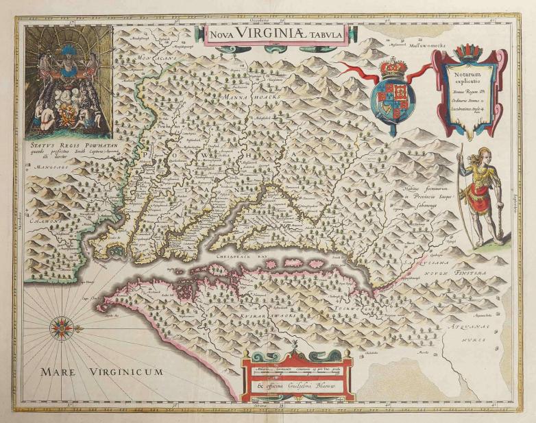 Hand-colored copper engraving by Willem Janszoon Blaeu (1571-1638), titled Nova Virginia Tabula, 17 ½ inches by 22 ½ inches, with Native American vignettes (est. $1,000-$2,000).
