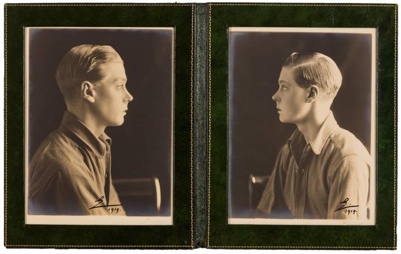 The photographs, signed by the Bassano studio of London with photographer's pencil marks along the margins, show the prince in mirror-like head and shoulders profile poses. Each image is signed and dated E.1919 on the front and David, Aug 1919 on the verso.