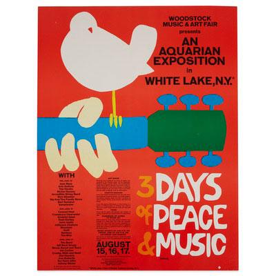 Apropos to all this, a vintage Woodstock poster--the iconic red poster featuring a stylized dove perched on the fretboard of a guitar--is headed to auction on January 31 in Philadelphia. Designed by Arnold Skolnick, the groovy poster advertises "3 Days of Peace & Music," in White Lake, NY, and features the names of performers like The Who, Jimi Hendrix, and Janis Joplin. The estimate is $800-1,200.