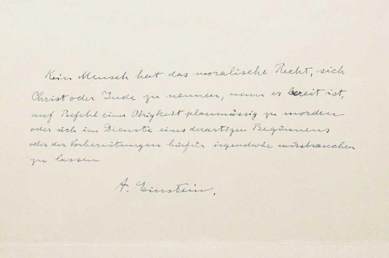 Starting in 1925, the French Academy began sending large sheets to important scientists, writers and intellectuals – asking them to inscribe it with a statement on the concept of peace, with the idea of collecting an anthology of these messages. The World League for Peace later released a limited edition of prints from the submissions under the title Pax Mundi: livre d’or de la paix, and this is Einstein’s unique manuscript submission. Translated from the German, it reads, “No person has the moral right to call himself a Christian or Jew so long as he is prepared to engage in systematic murder at the command of an authority, or allow himself to be used in any way in the service of war or the preparation for it.”