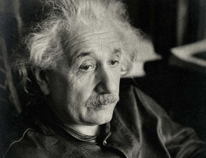Yousuf Karsh’s images of Einstein are perhaps among the most well-known and celebrated today. Having survived the Armenian genocide and fled to Canada, Karsh became one of the greatest working portrait photographers of his day, and this meticulously lit image was chosen as the frontispiece for the 1949 book Albert Einstein: Philosopher-Scientist. Einstein inscribed this image in German with the message, “The grace of clarity often comes to you, in uniting precision and depth.”