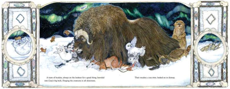 Many of her books are set in far-flung locations—Norwegian woods, Japanese gardens, Russian farmlands—and travel has long been a prerequisite to examine the places that form the backbone of her work. Her last research trip was to Alaska for her 2020 book, Cozy, whose protagonist is a muskox. Brett reveled in the details of this snowbound creature: “Muskox are like Arctic goats, but from the Pleistocene. The muskox went mostly extinct—a few survived in Greenland and were reintroduced in Alaska in the 1950s. Their fur hangs like a giant skirt, and underneath they have these fat little white legs.” In Cozy, animals find refuge from winter’s chill under the muskox’s fur, and everyone must try to get along, which seemed fitting in 2020 when many of us were homebound.
