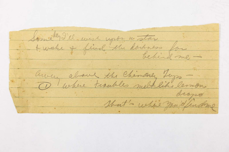 The highlight of the collection is the only lyric sketch for Over the Rainbow known to exist. “Some day I’ll wish upon a star + wake + find the darkness far behind me,” Harburg scrawled in pencil on a scrap of yellow legal paper. This was perhaps the start of his creative process for a song that won the Oscar for best original song.