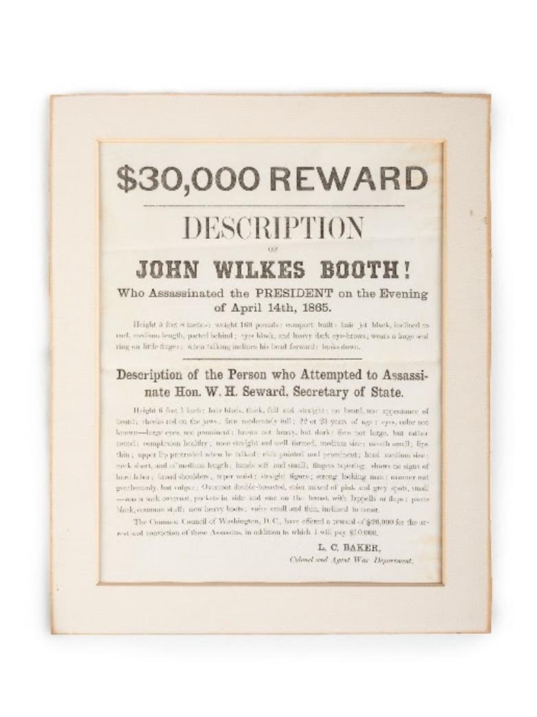 $30,000 Reward. Description of John Wilkes Booth! Price Realized: $31,250