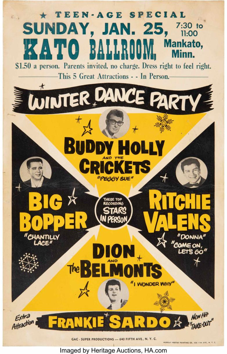 Dallas, TX – An exceedingly rare poster promoting a concert just a week before the plane crash that killed three performers is being brought to auction for the first time in Heritage Auctions’ Entertainment & Music Memorabilia Auction April 4-5 in Dallas, Texas.